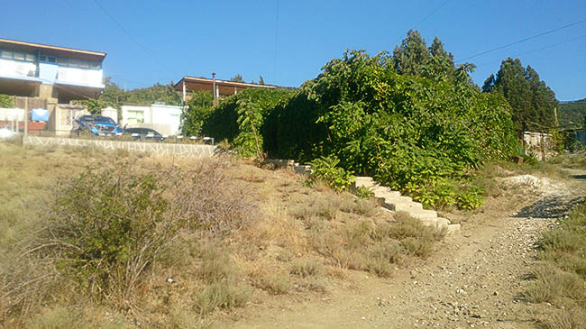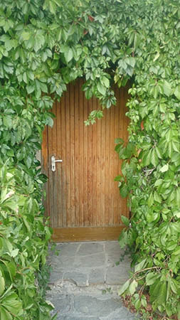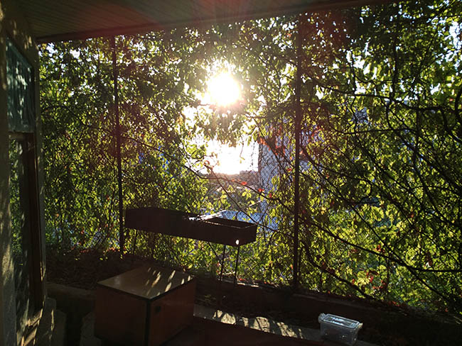 Однако мы остановились в необычном месте. Наверное, когда то был обычный сарайчик, но потом он зарос виноградом и приобрел уникальный внешний вид. Представьте зелёную стену, в которой находится дверь. Открыв ее, оказываешься внутри куста. Через заросли листьев открывается вид на Чёрное море. Дети сразу пришли в восторг, назвали это хоббитлендом и сказали, что отсюда никуда не уйдут. Ну, а мы были не против.