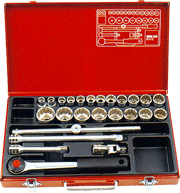 ОСОБЕННОСТИ: следует обратить внимание на трещотку. Она обладает двумя отличительными чертами: во-первых, это система переключения, которая представляет собой не традиционный рычаг, а металлическое колесико, насаженое на головку, и, во-вторых, это малый угол действия 6 градусов, что позволяет работать в ограниченном пространстве.ДИЗАЙН И МАТЕРИАЛЫ: набор упакован в металлический ящик, покрытый порошковым напылением, стойким к воздействию влаги, высоких температур, масел. Все детали изготовлены из хром-ванадиевой стали с полированным хромовым покрытием. Головки имеют закругленный профиль, увеличивающий площадь соприкосновения с гайкой. РЕЗЮМЕ: для своей области применения набор является хорошим профессиональным вариантом.