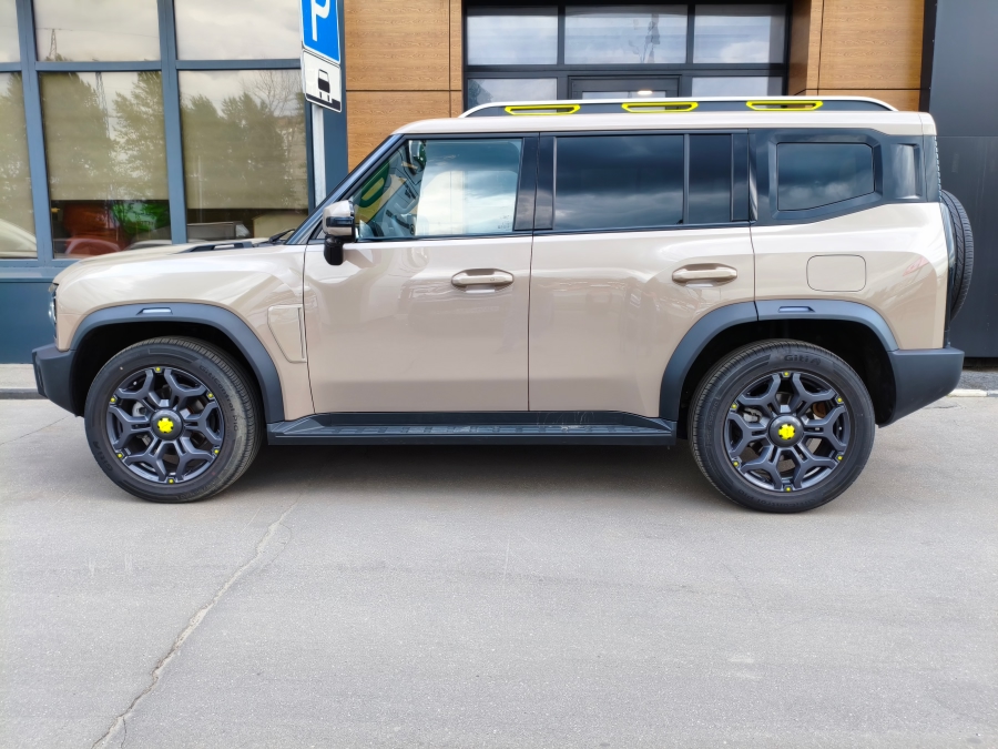 Завершая тему экстерьера Jetour T2, не могу не отметить ещё два момента, которые не оставили меня равнодушным. Первое — это цветовое акцентирование деталей кузова люминесцентно-жёлтым цветом. Выделены буквально крупные элементы: рейлинги, ступичные колпачки, болты и буксировочные петли. Но как же это к месту смотрится и как суперски дополняет визуальный облик автомобиля!
