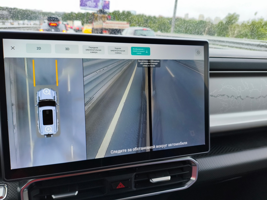На просёлке я включаю 360° камеру — но больше всего впечатлил режим «обзор под машиной». Я реально вижу, что под днищем! Камни, корни — всё как на ладони. В грязи и между колеями — бесценно. Да и маневрировать в городе между бордюров стало проще. Работает это следующим образом. Система «протягивает» картинку с передней или задней камеры в зону под днищем и дорисовывает ее. Если вы будете стоять, то зона останется серой, но стоит поехать как все заработает. В этом блоке я бы хотел еще отметить возможность контроля зоны около колес. Причем при движении назад контролируется задняя ось, а при движении вперед передняя. При этом картинку можно переключить так как нужно при парковке. Это позволяет проесть рядом с препятствием и самое главное припариваться к бордюру не повредим диски.