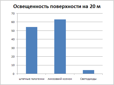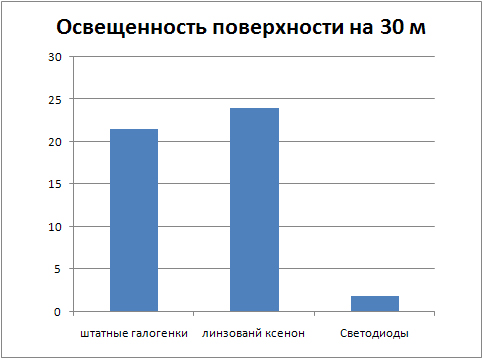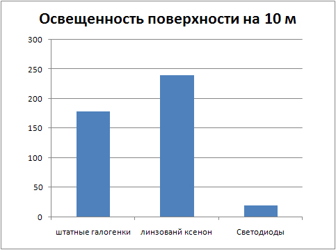 Измерение освещенности поверхности дороги при этом в среднем было более чем в десять раз хуже, нежели от штатных ламп накаливания.