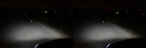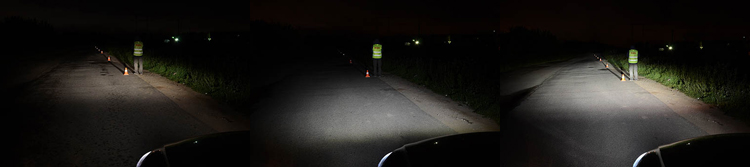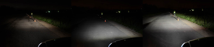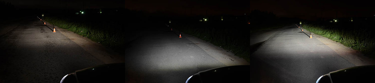 Сравнение светового пятна от разных источников света. Слева - штатный свет, галогенные лампы накаливания, по центру – светодиодные лампы установленные в штатную оптику, справа – линзованный ксенон Xenite L-03 врезанный в штатную блок фару.