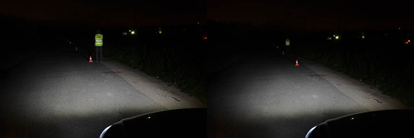 Освещение дорожного полотна, обочины и пешехода в жилете со светооражающими элементами на расстоянии 30 и 40 метров от автомобиля. Светодиодные лампы установленные в штатную оптику.