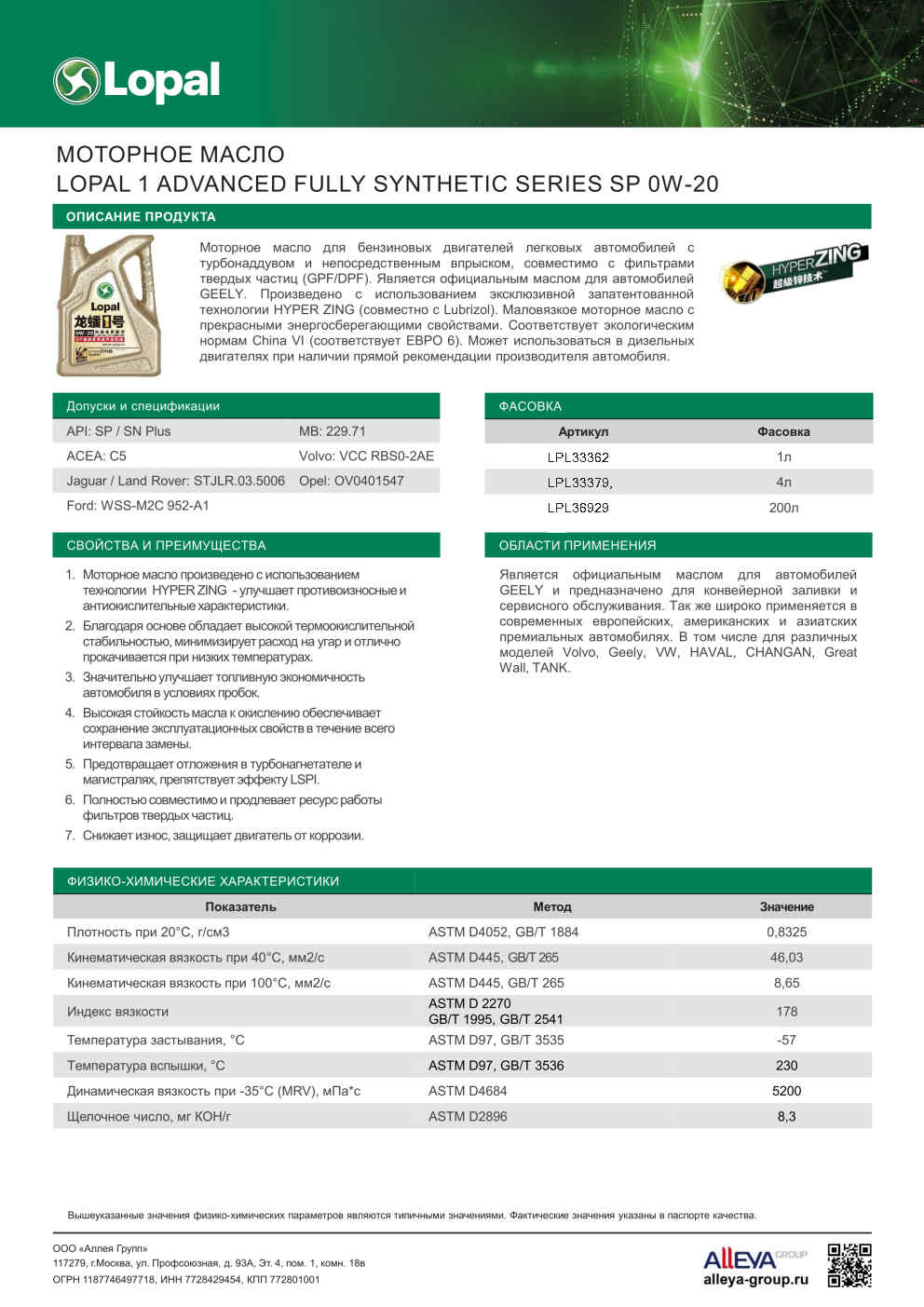 Паспорт моторного масла Lopal 1 Advanced Fully Synthetic Series SP 0W-20. Он содержит список допусков и спецификаций, описание свойств и преимуществ масла, а также его физико-химические характеристики, включая вязкость, индекс вязкости, температуру застывания и вспышки, TBN и показатели низкотемпературных испытаний.