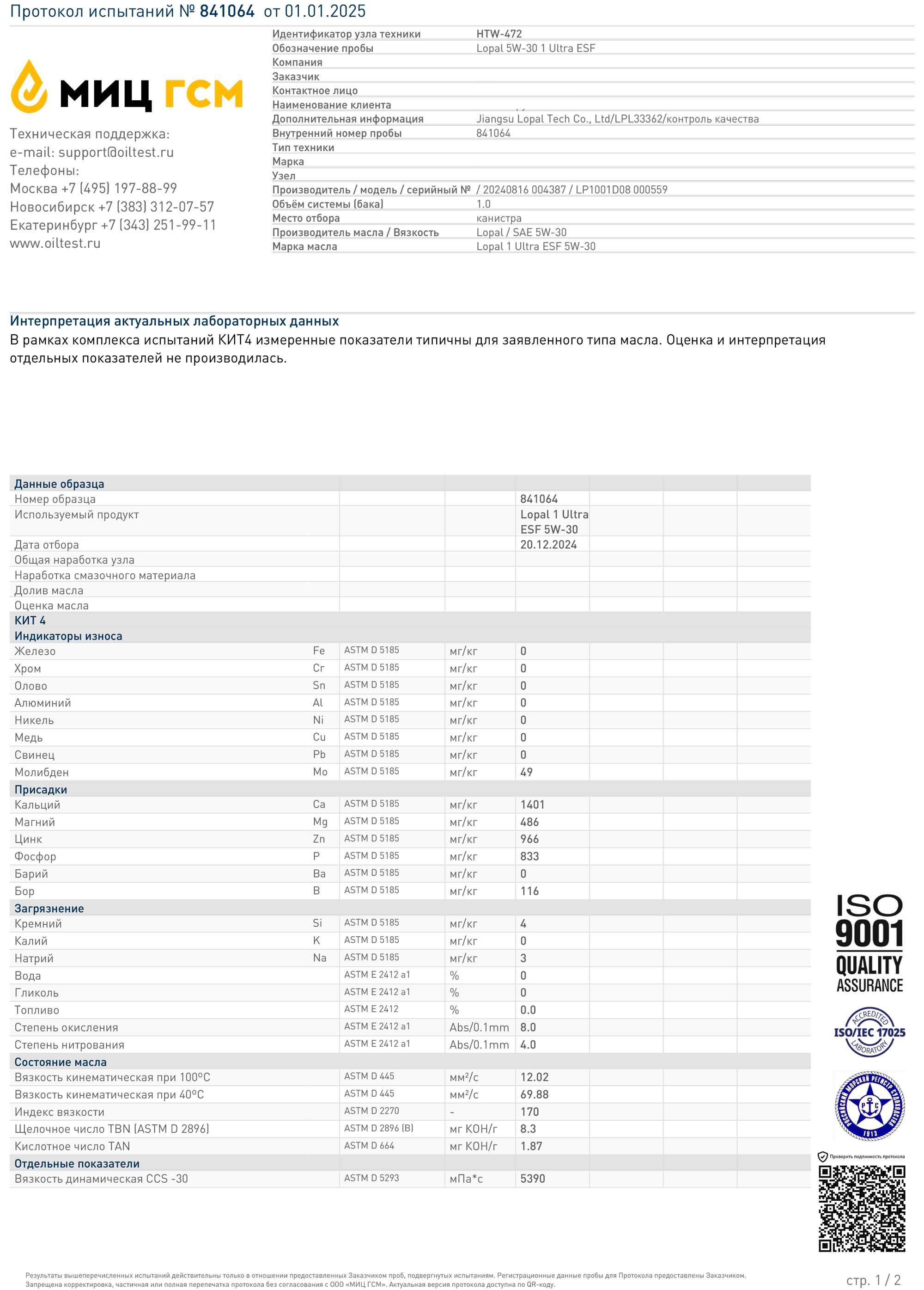 Для подтверждения соответствия заявленным характеристикам и стандартам API SP и ACEA C3 была проведена серия лабораторных испытаний свежего масла Lopal 1 Ultra ESF 5W-30 SP (протокол № 841064 от 01.01.2025 г.).