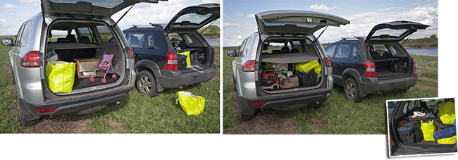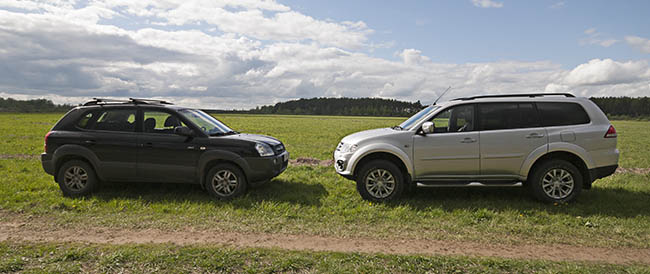 В Hyundai Tucson вещи занимали все имеющееся пространство, включая половину заднего сиденья и пространство в ногах задних пассажиров, а их размещение было образцом пространственного мышления гениального кладовщика. Любопытным оказался факт того, что высота поднятия пятой двери у обеих машин оказалась практически одинаковой, несмотря на существенную разницу в «росте». Девушки это оценили по достоинству, а представители мужской части экипажа (и снова, высокие) начали ворчать, что на бездорожье далеко не всегда будет удобно залезать в багажник. А вот вес дверей существенно разнится – чтобы закрыть багажник Mitsubishi Pajero Sport, надо энергично работать руками. К сожалению, это не единственная дверь, которая требует энергичных движений – остальные двери в Pajero Sport вполне соответствуют внедорожному характеру автомобиля.